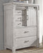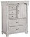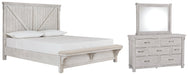 This versatile bedroom set brings a fresh twist to the modern farmhouse movement. The handsome, hearty profile of the high headboard bed is made all the more interesting thanks to planked faux barn door panels with metal hardware. Through-tenon styling incorporates a welcome touch of American craftsman style. And the easy on the eyes, distressed white finish? Just the tone for a soothing, serene bedroom retreat.