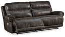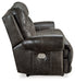 In charcoal gray, this 2-seat power reclining sofa with adjustable headrest offers the warm feel of fabric and the cool, rustic look of leather. Caressing you in comfort, the faux leather dual-sided recliner features luxurious bustle back cushions, plus jumbo window-pane stitching and nailhead trim for style. Easy View™ power adjustable headrests offer a primo view of the TV even when you're fully reclined, to enhance your relaxation. Chill out while you recharge thanks to a USB port built right into the one-touch power control.