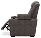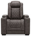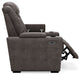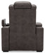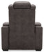 This power recliner in weathered gray is proof of just how far recliners have come when it comes to form and function. Ultra cool and contemporary, this fully loaded power recliner makes it so easy to social distance and make home your haven. Dressed to impress with diamond stitching inspired by sports car interiors, this recliner is covered in a fabulous faux leather with pebbled effect for authenticity. High-tech advancements include a one-touch power control with Easy View™ adjustable headrest and USB plug-in. Hidden storage compartments in the armrests are a welcome touch.