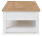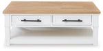 Casual style with substance. This two-tone coffee table raises the bar on comfortably cozy design. A sturdy silhouette with a classic white finish and black metal hardware exudes modern farmhouse vibes. The butcher block oak veneer top adds a relaxed aesthetic. And with two storage drawers and a lower shelf, this charmingly curated piece lets you display or tuck away.