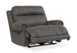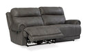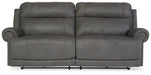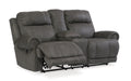 Sparing that "puffy" look you might expect from a recliner, this reclining sofa and loveseat set doesn't hold back when it comes to contemporary style. Subtle touches such as sporty jumbo stitching, nailhead trim and a "weather worn" effect on the upholstery give this handsome set a buttoned-up appeal and fresh feel. Loveseat’s center console with dual cup holders brings a handy element to the arrangement.