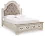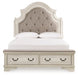 Elevating the art of traditional cottage styling, this queen upholstered bed is your dream bedroom retreat realized. A curvaceous beauty, this brilliant upholstered bed wows with dramatic scalloped details and fanciful trim work. The distressed chipped white finish charms with its heirloom appeal. Deep tufting on the cushioned upholstered headboard adds such a cozy element sure to put you at ease. Mattress and foundation/box spring available, sold separately.