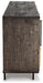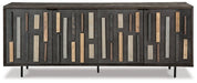 Elevate your contemporary home to a haven with an undeniably artistic attitude. This accent cabinet has a forward-thinking flair, featuring a modern mosaic created by strips of wood in varying hues against a dark brown and metallic gray finish. Fashionable and functional, the detailed doors open to reveal two shelves to suit all your storage needs.