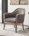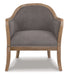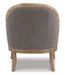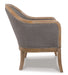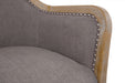 This modestly scaled accent chair is a chic design feat. Perfect for a corner spot or entryway, this curvaceous beauty sports a distressed finished frame and taupe-tone upholstery for an easy-on-the-eyes sensibility. Nailhead trim punctuating the front and back adds so much cool attitude.