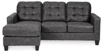 This ultra-contemporary sofa chaise invites you to spread out and make yourself comfortable. Linear track arms offer a clean, sleek aesthetic, while tufted box cushions are a nod to mid-century design. Rest assured, a movable ottoman and reversible seat cushions allow you to place the chaise on either side for the perfect fit. Gunmetal gray faux leather offers the cool, weathered look you love and touchably soft feel you crave.