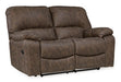 Living room lounging, with a touch of simply stunning character. This reclining loveseat seamlessly complements your contemporary cozy space. Accented by jumbo stitching, the versatile chocolate faux leather is a tried-and-true approach to everyday style. And with only a simple pull needed to extend the recliner on either side, this piece proves homey, inviting design and superb comfort go hand in hand.