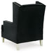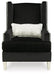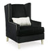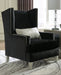 Talk about Academy Award winning style. Inspired by Hollywood Regency design, this stunning black upholstered accent chair brings glamour and indulgence into the here and now. Its wing back profile and nailhead trim are so rich and classic. Elegant turned feet in a dazzling silvertone finish perform beautifully, too. Bravo.