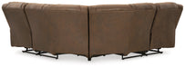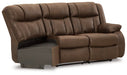 Melt into comfort at the end of your day. Accented by jumbo stitching, the supple walnut faux leather and sumptuous cushioning cradle your body in infinite positions of leisure. Simply pull the tab to recline. With dual cup holders and convenient console storage, this reclining sectional makes relaxation your sweet reward for all you do.
