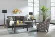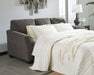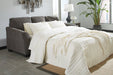 This on-trend sofa chaise sleeper is so casually contemporary. The 1970s era meets modern day allure with an energetic geometric pattern on the toss pillows. Paired together with slate colored menswear chenille, it’s incredibly comfortable and a show stopping sight. Pullout queen memory foam mattress is an added comfort for overnight guests.