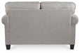 Sporting a pleasing roll arm for classic flair, this loveseat in soft gray exudes an easy elegance sure to please. Feel-good upholstery with linen texturing is made for everyday luxury. Muted-tone toss pillows are a soothing, sophisticated complement.