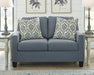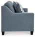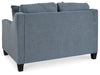 Sporting a 2-over-2 box cushion design for a clean and uncluttered aesthetic, this loveseat is a lovely choice in contemporary furniture. Elements include slim track arms with angled flair, sleek tapered feet and a feel-good flatwoven twilight blue upholstery that’s a refreshing change from the everyday ordinary. Assorted throw pillows in mellow, muted tones incorporate an updated farmhouse look.
