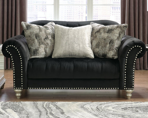Talk about a looker. The Merrimore loveseat has folks head over heels in love. More than easy on the eyes—with its nailhead trim accents, linen-loo...