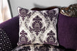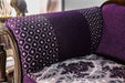 Purple has been the color of royalty for centuries, its hue resonates with class and an air of dignity. This sofa set honors that tradition and builds on it with stunning carved wooden trim and bun feet, patterned pillows and curvaceous rolled arms. The honeycomb patterned arms help embellish the curl, a fleur de lis emblazoned seat cushion lends to the royal visage of this luxury set. Bring this set home and let it inspire a more dignified living room arrangement.