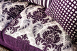 Purple has been the color of royalty for centuries, its hue resonates with class and an air of dignity. This sofa set honors that tradition and builds on it with stunning carved wooden trim and bun feet, patterned pillows and curvaceous rolled arms. The honeycomb patterned arms help embellish the curl, a fleur de lis emblazoned seat cushion lends to the royal visage of this luxury set. Bring this set home and let it inspire a more dignified living room arrangement.