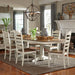 Create a grand gathering with the Springfield double pedestal table set. Crafted of poplar and rubberwood solids with white oak veneers, this set features a cream finish on the base with a honey top and consists of the double pedestal table and four ladder back side chairs. This table is impressive in size as it contains two 1” butterfly leaves that can be used separately or simultaneously for large scale dining and is anchored by heavy turned pedestals that flow into splayed feet with a center trestle. The ladder back side chairs have a wood seat with heavy turned legs and nylon chair glides to protect your flooring. The Springfield collection is appealing as it evokes nostalgia for earlier times.