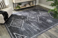 Drawing on Southwestern weaving motifs, this area rug features a repeating pattern with geometric borders. Its distressed design, in a palette of white, gray and black, provides a distinctive look and feel for interiors ranging from modern contemporary to boho chic. A low pile height makes it ideal for high-traffic spaces.