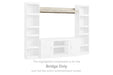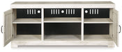 Express your farmhouse style with this entertainment center. Its wispy white finish over replicated oak wood grain is a delightful change from the ordinary. Clean-lined, classic styling with barn door inspiration provides a country chic aesthetic that’s a breath of fresh air. Combination of cabinet storage and open display space with LED lighting makes for just the right mix.