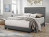 The Ishiko II bed provides a commanding presence in any room. This contemporary panel bed features a fully padded rectangular headboard with low profile footboard in a luxurious gray fabric. The headboard is accented with geometrically patterned nailhead trim in a chrome finish. The bed's clean line design will go with various styles of case good finishes and will become the focal point in any bedroom.