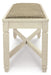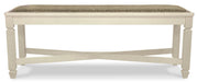 The beauty of this upholstered dining bench is something to savor. Serving up comfort and flair, this generously scaled bench entices with a cushioned seat covered in a heavy woven fabric that complements the antiqued white finish.