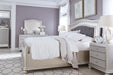 View full detailsThis king upholstered bed allures with the glitz and glam befitting silver screen queens. Textured gray vinyl with crystal-look button tufting chan...