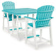 Raise the bar on outdoor living with this dining set. Crafted for style and durability, the counter height stools and table feature a slatted design that easily sheds rainwater, and a two-tone look that pairs a light turquoise and white for twice the interest. The table's umbrella hole lets you throw some shade on your outdoor living space.