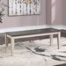 The weathered Antique White brushed finish of this set reflects the organic appeal of a rustic farmhouse environment, but the designs contained within are the stuff of legend. The grand base of the table maintains the theme with sweeping pillars attached to cross-connected feet. Throw in a bit of contrast with the natural color of the wooden top and a timeless ensemble is borne.