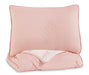 Bring a sophisticated look to your bedroom with this comforter set. Featuring a solid pink background with a stitched diamond design, the comforter reverses to a crisp and fresh arrow design in pink, white and gray—giving you the choice to change up your bedroom decor quickly and easily.