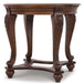 This occasional table set deserves a toast for incorporating so many elements so seamlessly. Swirls of metal accents add a lovely dimension under a beveled glass inset tabletop. Their fanciful pattern is echoed in the carvings and curves of the richly stained legs and stretchers.